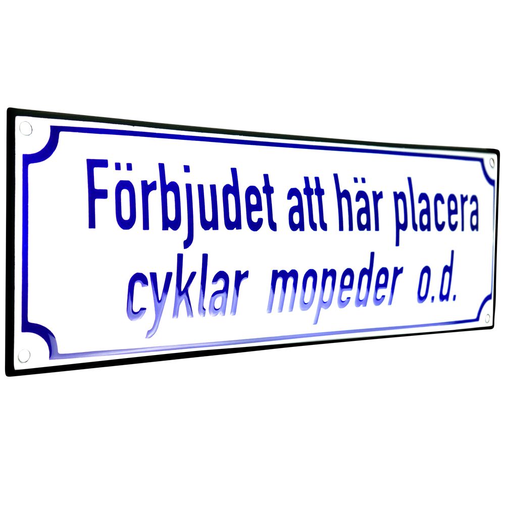 Emaljskylt Förbjudet att här placera cyklar mopeder od vit - blå 30 x 10 cm modell 38