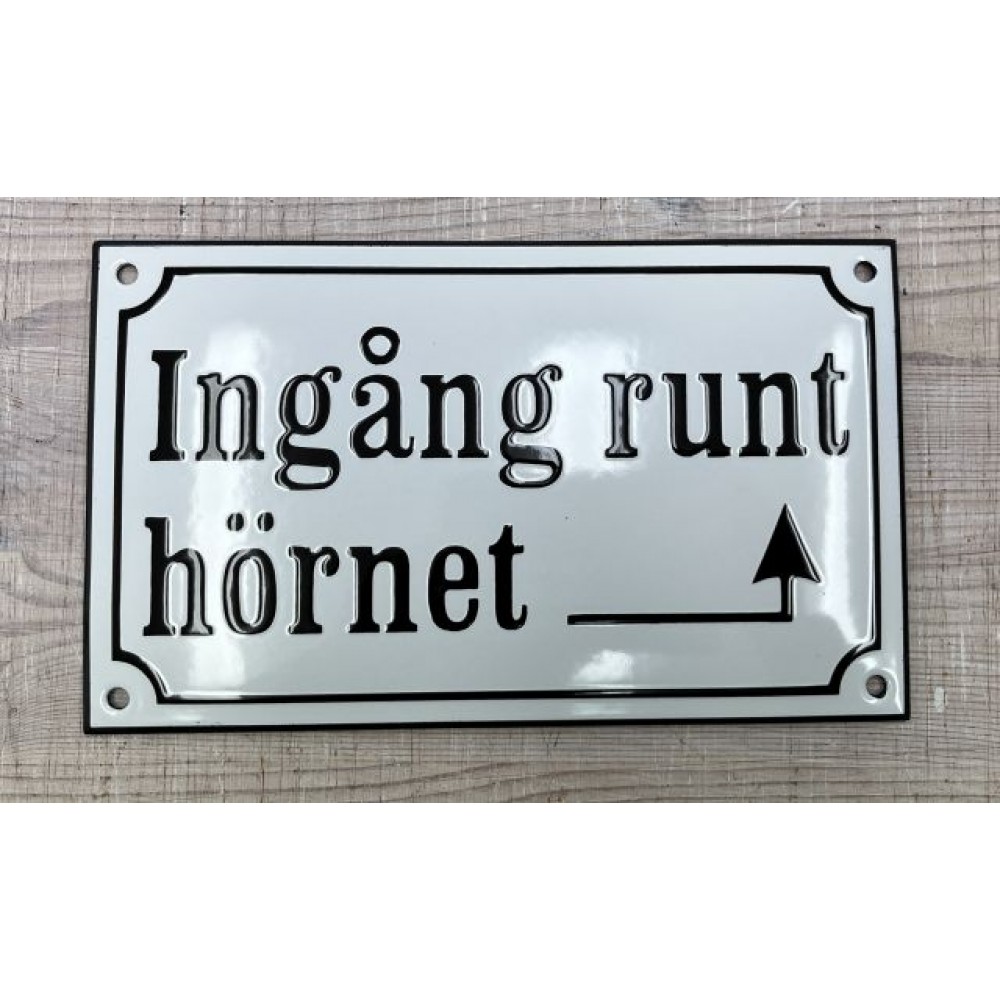 Emaljskylt Ingång runt hörnet med pil höger vit - svart 20 x 12 cm modell 10