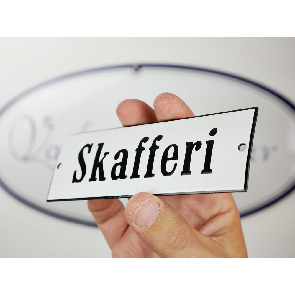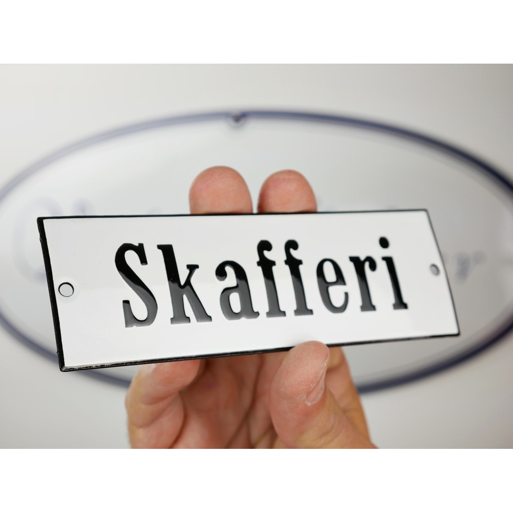 Emaljskylt Skafferi vit - svart 15 x 5 cm modell 2
