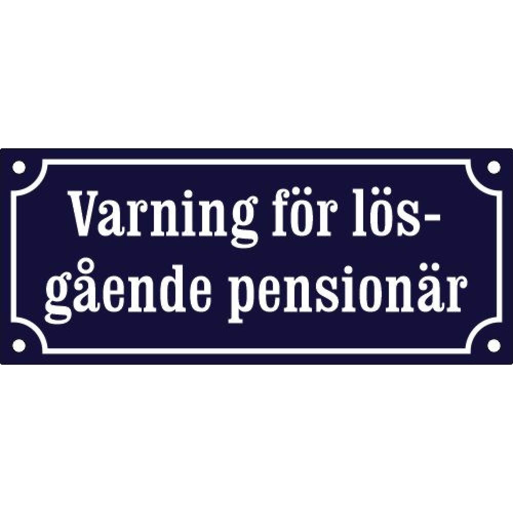 Emaljskylt Varning för lös-gående pensionär 19x8 cm koboltblå-vit