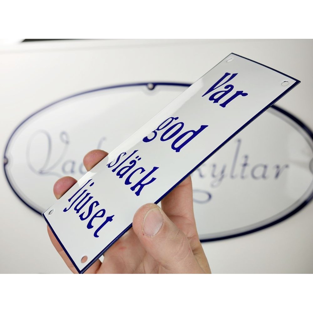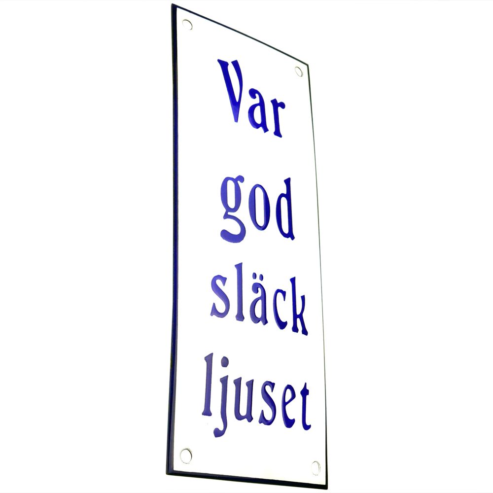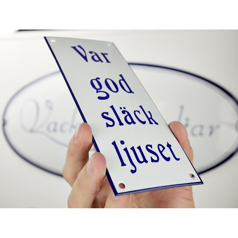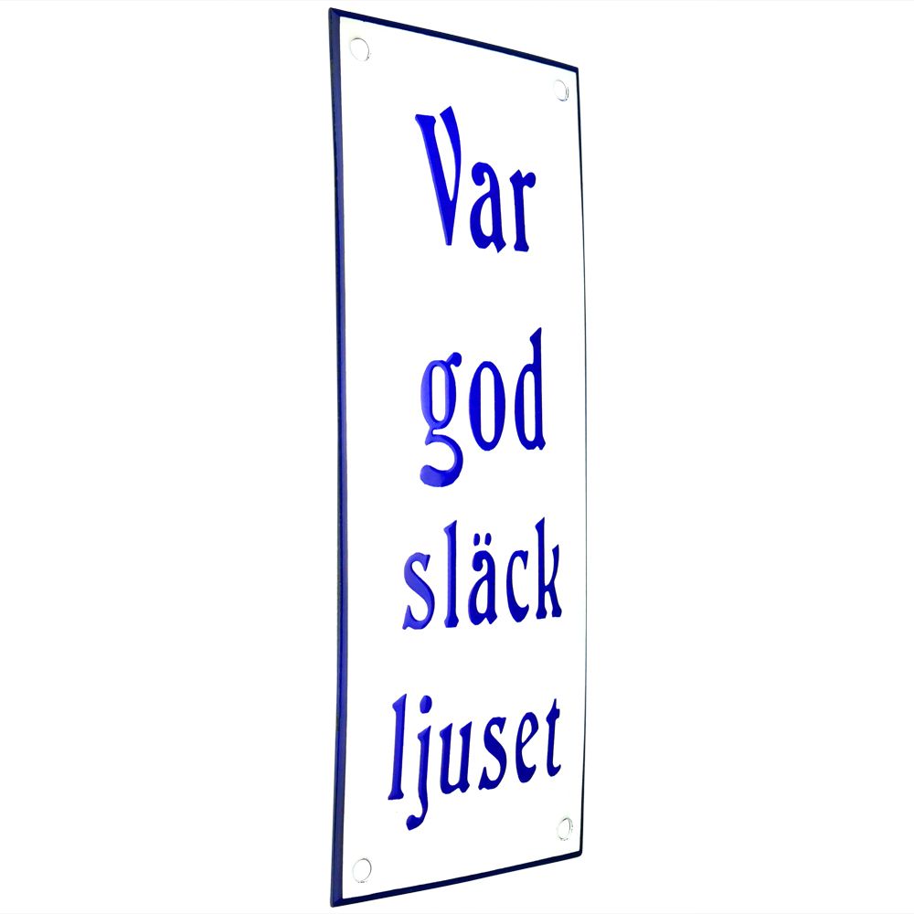Emaljskylt Var god släck ljuset vit - blå 8 x 20 cm modell 47