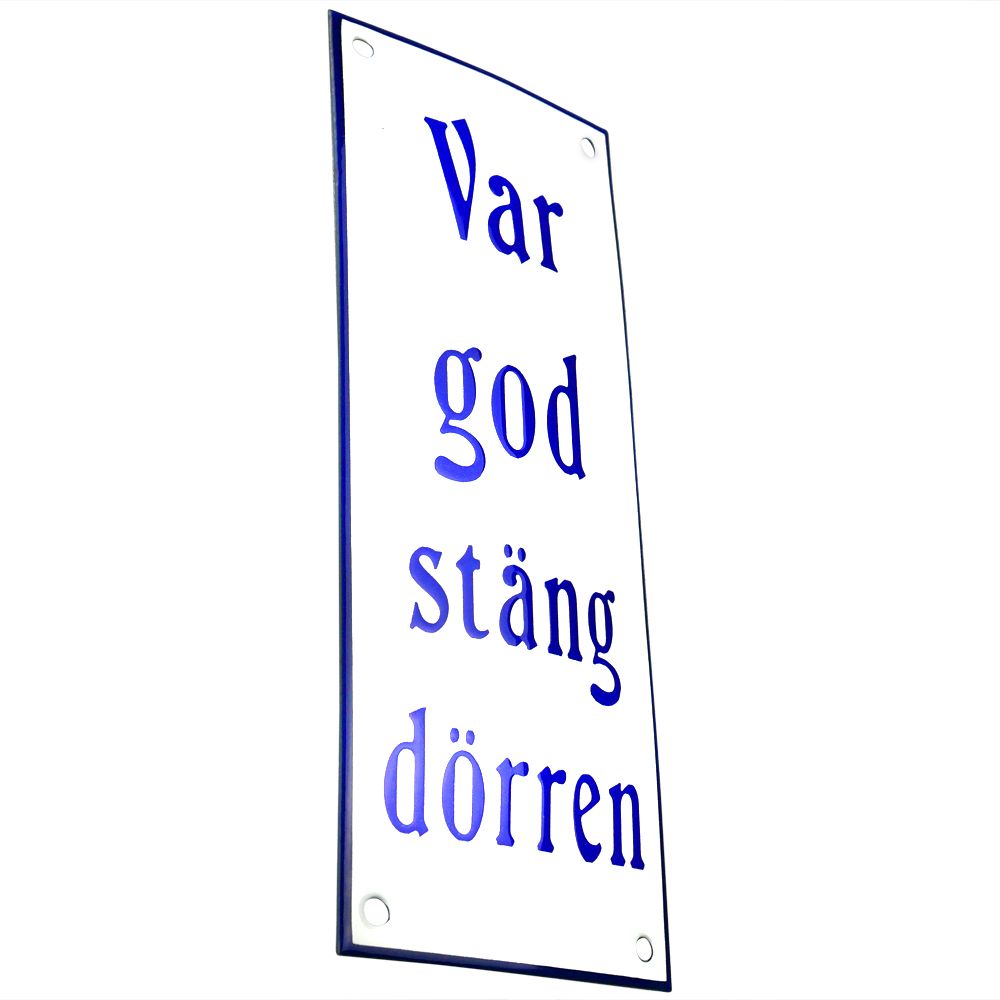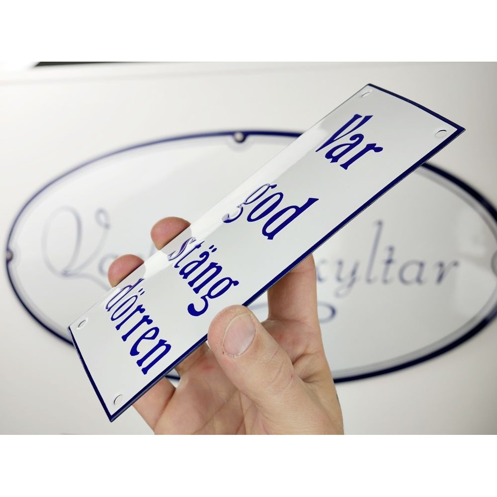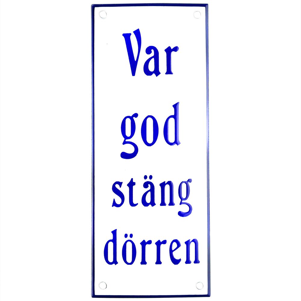 Emaljskylt Var god stäng dörren vit - blå 8 x 20 cm modell 47